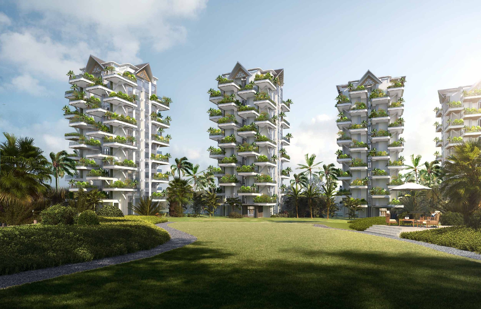 项目位于西双版纳景洪市西北部,景洪市工业园区嘎栋片区内,项目基地周边交通便捷。通过打造住宅、商业一体化的居住空间,为景洪市的建设添砖加瓦。本项目以景洪市丰厚悠久的民族文化气息为主题,塑造具有当地深厚民族文化底蕴的住区,结合当地优质的地理环境和多姿多彩的文化风俗打造一个充满人文气息的生活之地。住宅与旋转叠加的空中花园组成垂直式的森林花园建筑。露台外伸、奇偶层错位的布局,使得每一层都有庭院,户户都有花园,彻底打破了“底层才有庭院,顶层方得露台”的传统建筑模式。屋顶的设计融合当地文化特色,为西双版纳增添了一道充满人文风情的建筑风景线。