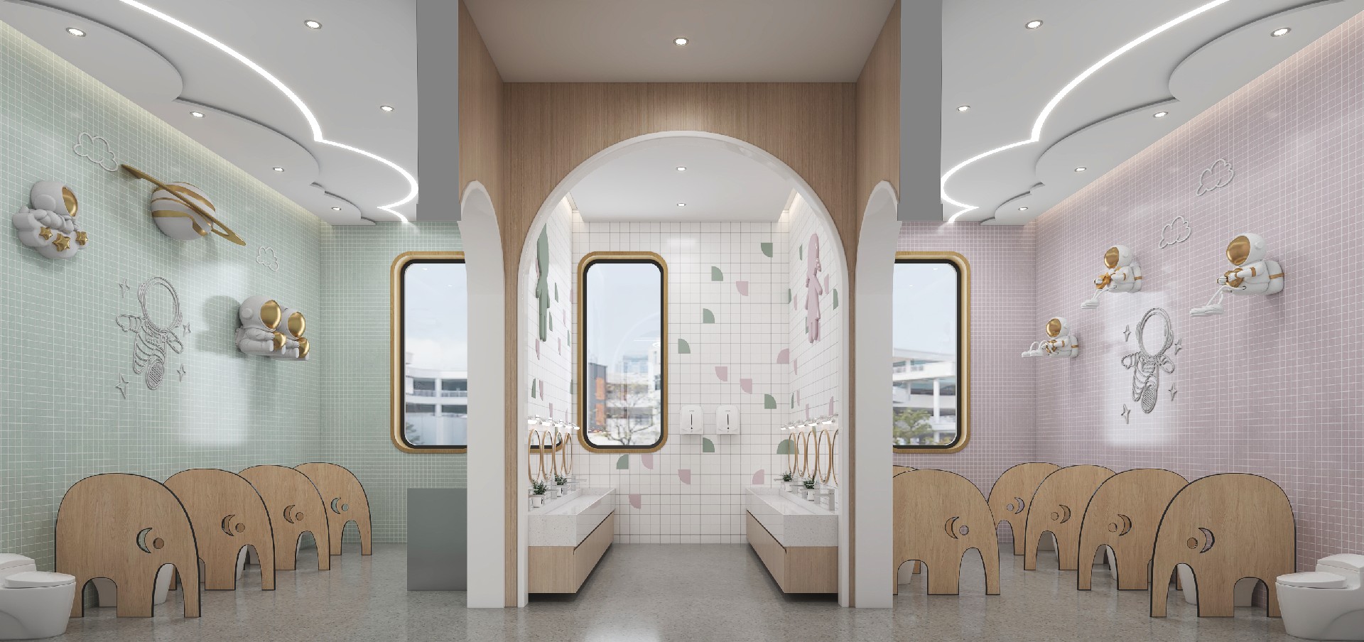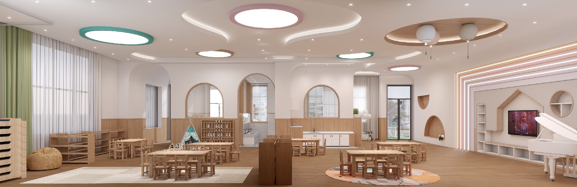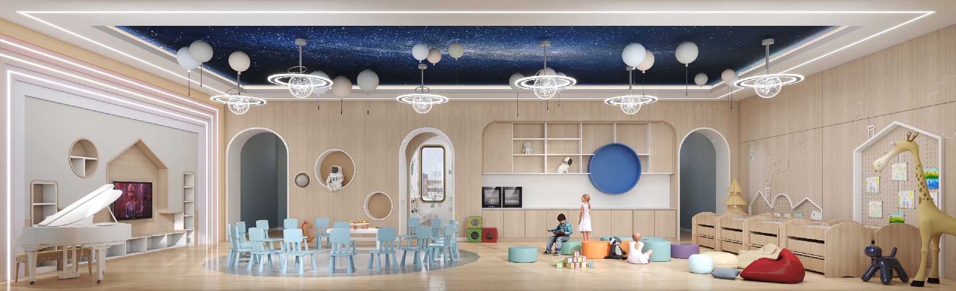 本项目位于四川省成都市青羊区金沙街道,该项目位于城市中心,是该地段少有的拥有大面积户外场地的场所。场地的户外平台和周边的室内空间呼应,是一个围合式场地。 基于场地与自然,以最少的干预,为孩子们营造了一个个 不受约束、自由撒欢的地方。