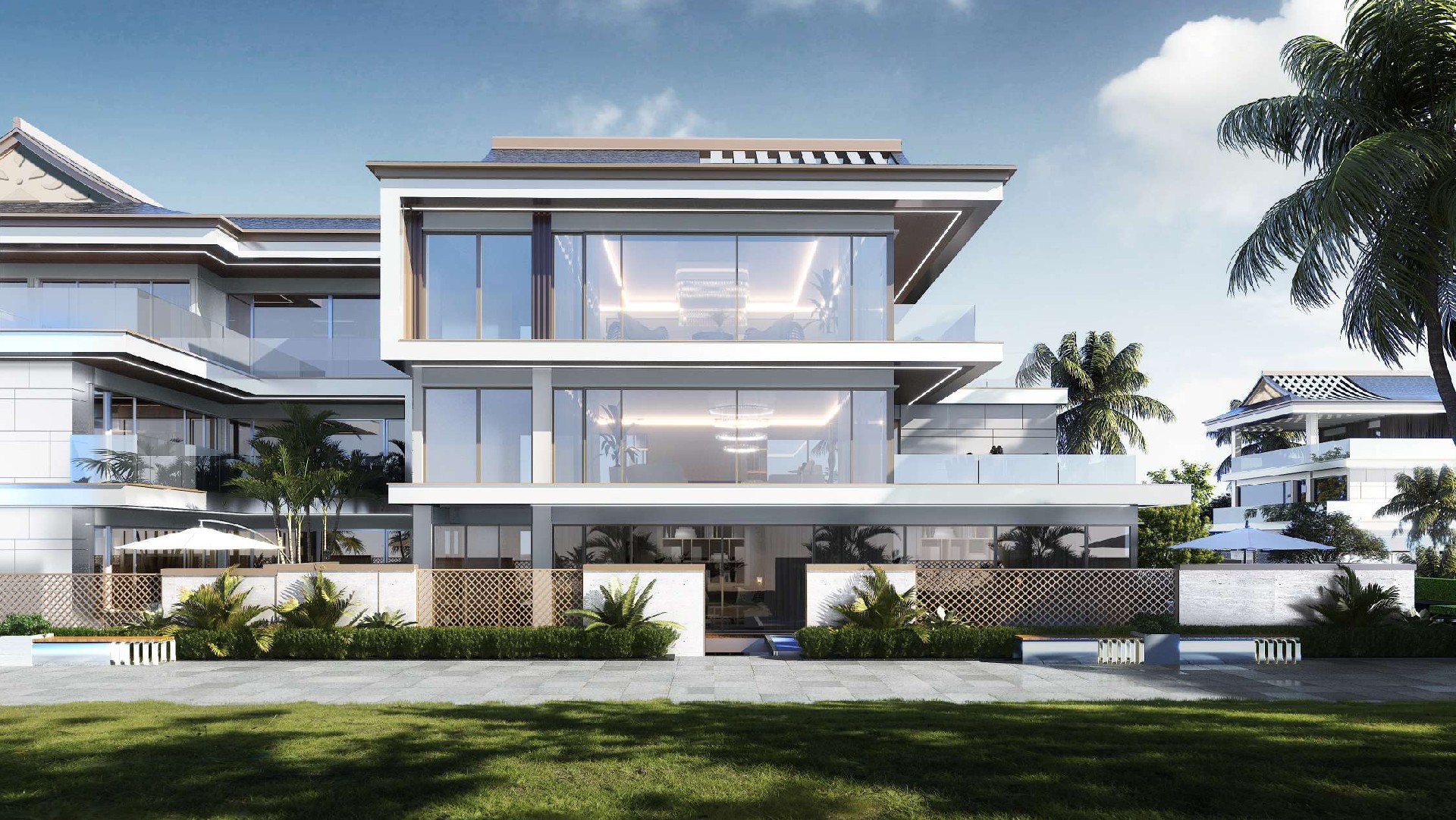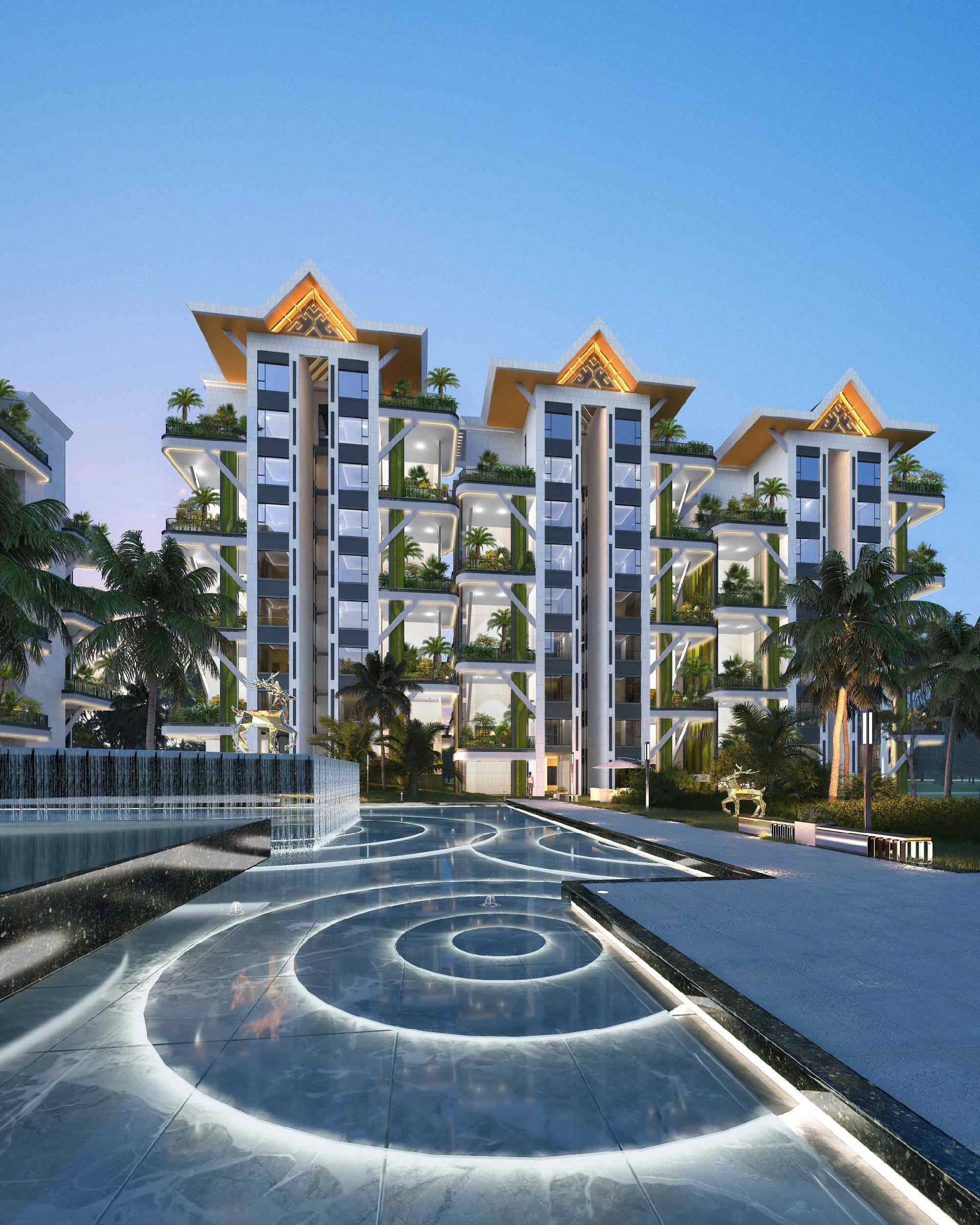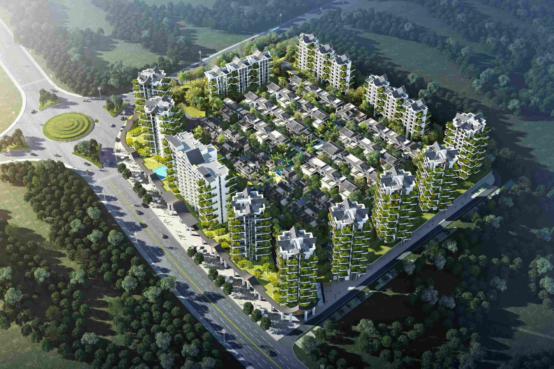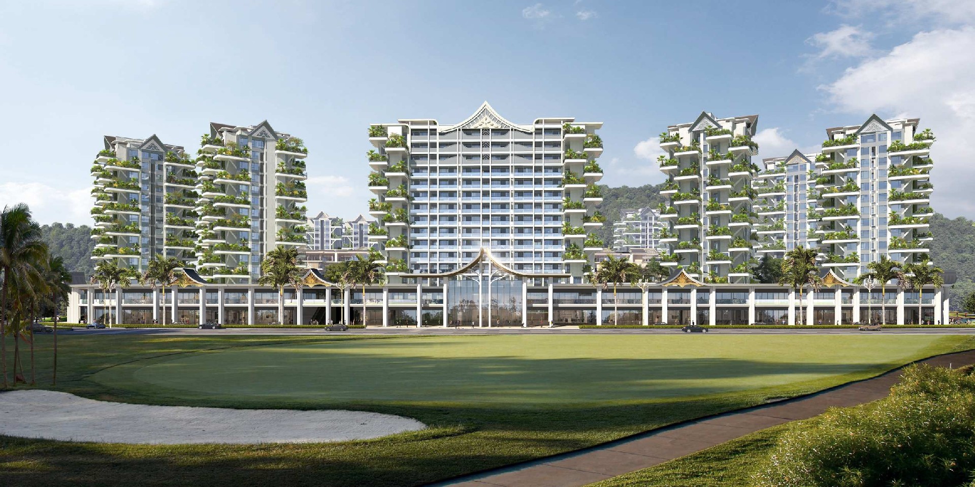 项目位于西双版纳景洪市西北部,景洪市工业园区嘎栋片区内,项目基地周边交通便捷。通过打造住宅、商业一体化的居住空间,为景洪市的建设添砖加瓦。本项目以景洪市丰厚悠久的民族文化气息为主题,塑造具有当地深厚民族文化底蕴的住区,结合当地优质的地理环境和多姿多彩的文化风俗打造一个充满人文气息的生活之地。住宅与旋转叠加的空中花园组成垂直式的森林花园建筑。露台外伸、奇偶层错位的布局,使得每一层都有庭院,户户都有花园,彻底打破了“底层才有庭院,顶层方得露台”的传统建筑模式。屋顶的设计融合当地文化特色,为西双版纳增添了一道充满人文风情的建筑风景线。